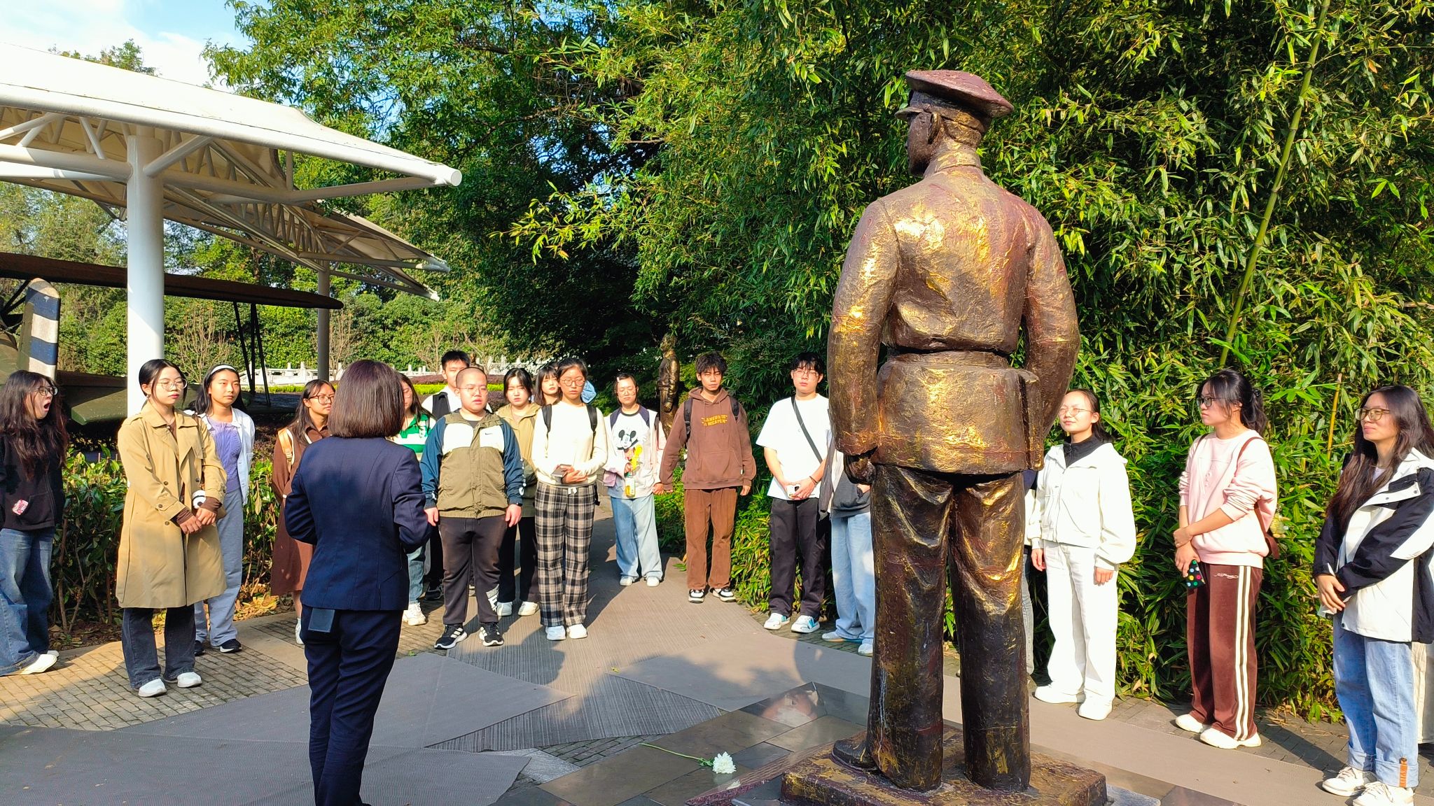 师生在讲解员的带领下先后参观了“奋勇抗战”“国际援华”“壮志凌云”“缅怀先烈”四个室内馆区及陈列雕塑、战机模型的两个室外展区,通过实物、文字、图片、影像等了解了中国空军和国际援华空军共同抗击侵华日军的英雄事迹。在“奋勇抗战”展厅,师生目睹中国空军在抗日战争中的艰苦斗争和巨大牺牲;陈列雕塑的广场上,听闻中国空军的英雄事迹,了解到中国第一代飞行员平均23岁,几乎全都壮烈殉国,同学们赞叹先辈的“先锋精神”,也感叹今日和平生活来之不易,应倍加珍惜。在“国际援华”展厅,诸多国家援助中国抗日,不远万里来到中国、与中国空军并肩作战的丰富史料,令师生切实看到各国人民对于和平正义的捍卫,深感敬佩。