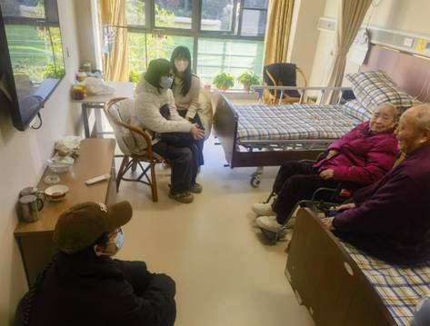 随后,同学们入户探访了住在护理院的老人们。他们聆听老人们的故事,分享自己的生活经历,让老人们感受到了来自社会的关爱和温暖。这些交流不仅丰富了老人们的精神生活,也让同学们更加深刻地理解了老年人的需求和期望。
