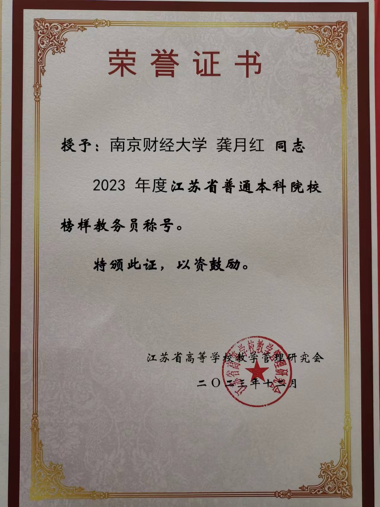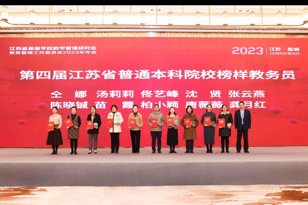 2023年12月6日至8日,江苏省高等学校教学管理研究会教务管理工作委员会2023年年会在江苏省盐城市召开。我院教务科研办公室主任兼教学秘书龚月红获评第四届“江苏普通本科院校榜样教务员”,全省共10位教师获此殊荣。榜样教务员评选旨在表彰和激励本科教学管理工作中勤勉负责、工作突出的基层教学管理人员,调动教学管理人员工作的积极性与创造性,促进教学管理改革,提高教育教学质量。
