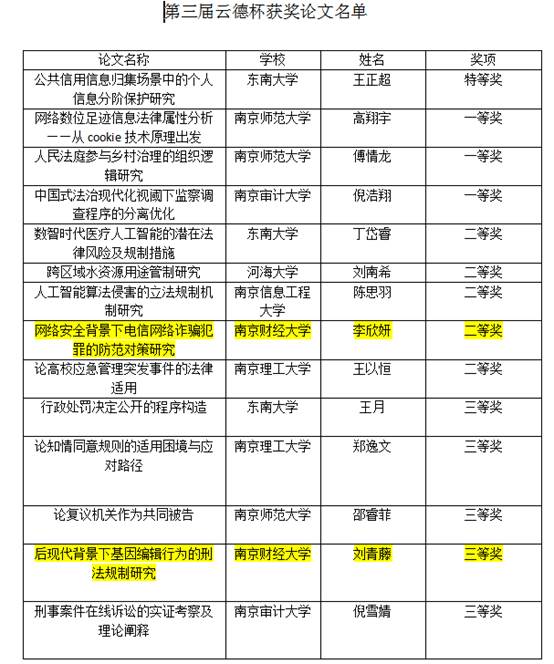 近日,第三届“云德杯”法科研究生学术论文写作大赛圆满落下帷幕。我院2022级专硕研究生李欣妍喜获二等奖,2021级学硕研究生刘青藤喜获三等奖,充分展现了学院风采和自身学术水平。