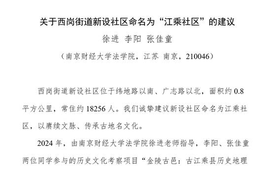 正值《江苏省地名管理条例》修订公布之际,10月9日,栖霞区西岗街道开展了新设社区命名工作,公开征集社区名称。该新设社区以仙林湖公园为中心,其历史源流与我院一项大学生创新创业项目具有较高契合度。在我院法律系主任徐进老师指导下,项目主持人、法学专业2023级本科生李阳、张佳童撰写了新设社区命名建议。10月22日,徐进老师和李阳、张佳童,以及2024级硕士研究生梁子慧受邀赴西岗街道参与专家论证会。