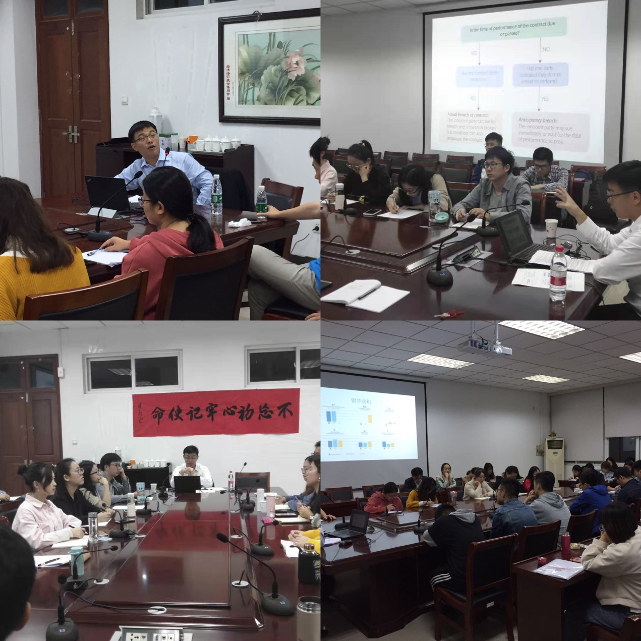 首先,严忞副教授对合同违约的类型以及免责条款和损失的界定进行了详细的解释说明。然后,严忞副教授提出了五个相关问题供学生讨论。特别是最后一个案例分析,主要鼓励学生灵活运用本次课程中所学的知识来解决实际案例问题,调动了大家的学习积极性,获得了很好的教学效果。最后,严忞副教授鼓励大家在研究生阶段要努力学习专业知识,追随自己的梦想,相信功夫不负有心人,有付出一定会有回报。
