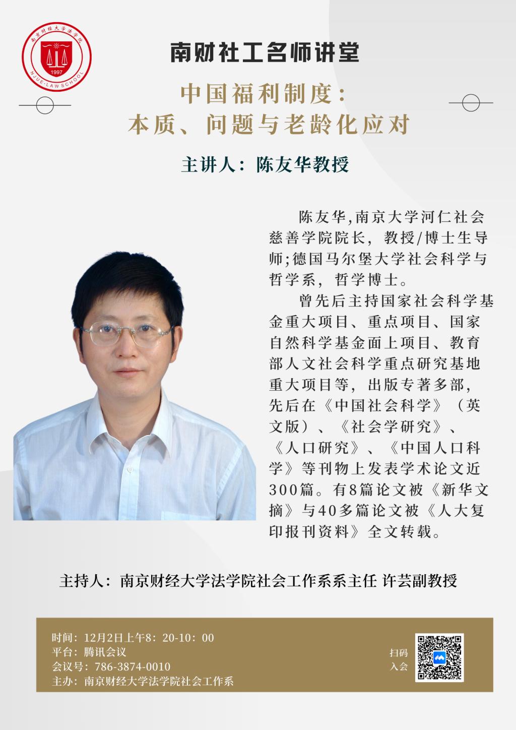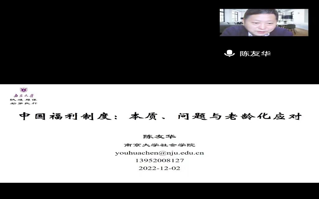 2022年12月2日上午,南京大学河仁社会慈善学院院长、博士生导师陈友华教授应我院邀请为我院师生作了主题为“中国福利制度:本质、问题与老龄化应对”的讲座。本次讲座通过腾讯会议的方式举行。讲座由我院社会工作系系主任许芸副教授主持,我院社工系师生参与聆听。此外,该讲座还吸引了其他大学社会工作专业教师和研究生前来交流学习。