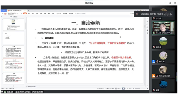 讲座中,张仁善教授以我国传统化解民间纠纷的重要手段之一——“调解”为主题,讲述了传统纠纷调解模式以及调解对社会产生的正负效用,以此展开对纠纷化解多元化路径的探索。他表示,在传统的纠纷调解模式和机制中,以“宗族调解”最为普遍,族规族约承袭了儒家的礼制规范,起到了“补官法之不足,作良民之保障”的作用。国家大力倡导宗族及乡绅的自治调解权,纠纷发生后优先选择宗族内部解决,以达到“法致中和,囹圄常空“的效果。张仁善教授同时也指出,调解作为一种纠纷解决模式既能起到正面效用,也有一些负面效用。在社会转型时期,学习传统的调解模式对现代法治研究的意义,我们应辩证看待,甄别其优劣价值,为纠纷的化解及现代化法治的发展提供更多的路径选择。