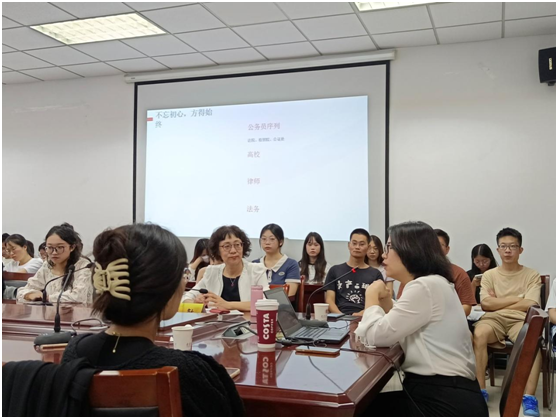 讲座中,李丽博士首先介绍了自己的求学及工作经历,为接下来的职业生涯介绍提供了丰富的个人经验。其次,李丽博士重点讲解了法律人的四种职业选择,包括公务员序列、高校老师、律师和法务,并分析了各种职业的特点。她在公务员序列中首先推荐法院,认为法院很能锻炼工作人员的能力,并鼓励年轻人要勇敢尝试,“年轻是最大的财富”,毕业生在目标没有那么明确时可以先尝试报考公务员。再次,李丽博士较为细致地介绍了律师职业,认为这是一项包容性强的职业,能让人得到非常好的磨炼。她从律师的工作特点入手,强调律师的工作重点在于按时按要求地满足客户的需求,因此工作强度很大,提醒有意向从事该行业的同学们要做好心理准备。最后,李丽博士以自身为例详细介绍了公司法务的工作内容,简单阐述了法务的职责职能和人员构成。一般来讲,主要分为日常法律事务支持、知识产权服务、争议处理、投融资及上市合规、立法研提与法规落地。她从自身经历出发,提出了一点特别的感悟,即法务的底线是不能只说“不”,而是要解决问题。同时,李丽博士强调了读研的重要性,认为硕士学历是当下很多法律职业的门槛,并鼓励同学们走适合自己的路。